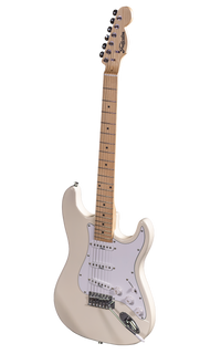 Our Olympic White electric guitar creates a unique contrast with two different shades of white, on the body and on the pickguard, in high gloss paint. It features a double cutaway alder body with a maple matte finish on the neck.